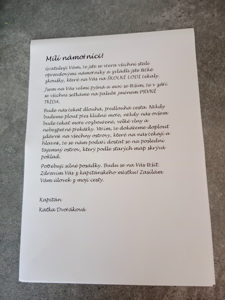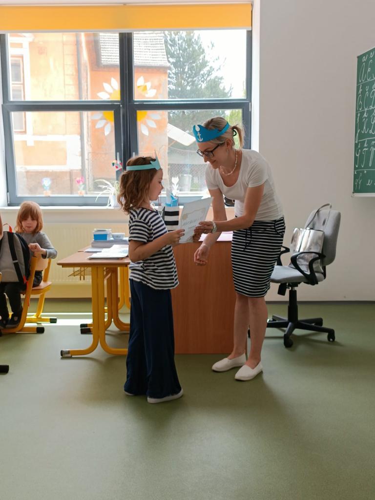 Na poslední setkání přišly děti oblečené za námořníky a čekalo je zakončení jejich adaptačního programu na školu. Závěrečná část byla slavnostnějšího rázu. Nejprve děti obdržely poslední odznáčky za jejich splněné úkoly a poté se pustily do výroby námořnické čelenky. Jelikož se všem podařilo získat námořnický odznáček, mohli být pasováni na NÁMOŘNÍKY! Všichni dostali diplom námořníka a vydali se na první průzkumnou misi po ŠKOLNÍ LODI. Malí námořníci objevili, kde se ukrývá školní knihovna, ateliér, ředitelna, sborovna, družina a další. Druhý den ještě měli námořníci malé překvapení. Lodní poštou obdrželi do školky vzkaz v láhvi a malé sladké dárečky ???? Adaptační část byla ukončena. Z předškoláků se u zápisu stali rybáři, během adaptačního programu povýšili na námořníky a v září je čeká vyplutí do světa nových vědomostí ???? Plavba to bude místy náročná, ale pevně věřím, že se nám podaří zdolat všechny nástrahy a doplujeme až na poslední ostrov, který podle starých map, ukrývá poklad. VZHŮRU NA PALUBU! Kapitán Katka Dvořáková