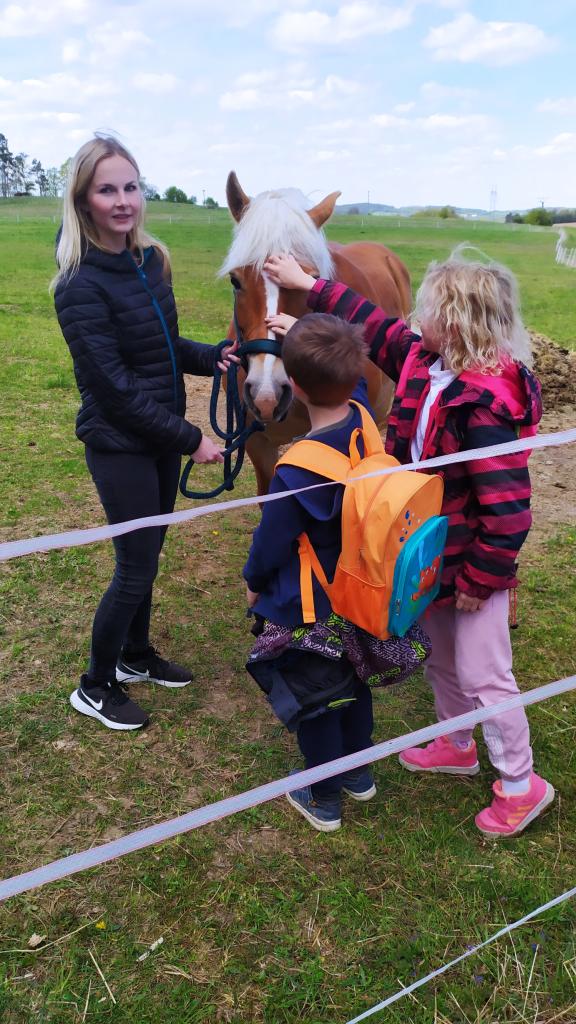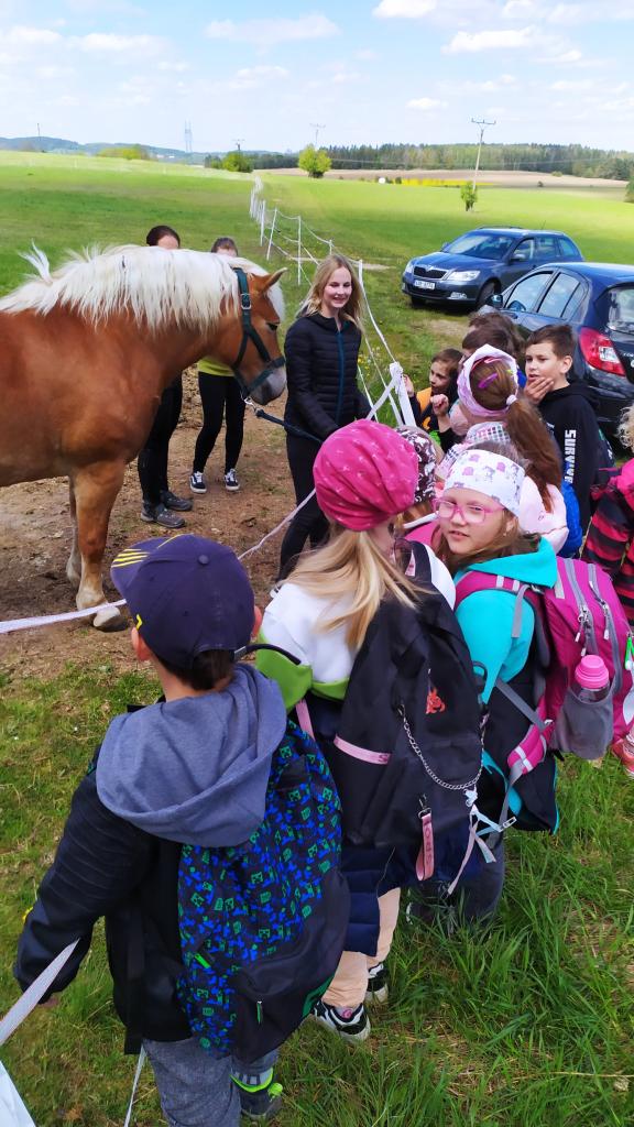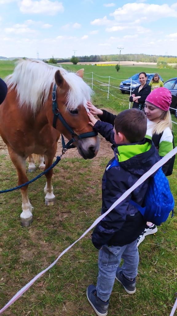 V Šebánovich na děti čekalo milé překvapení. Mohly si pohladit koně s paní učitelkou Vodičkovou a Kytlerovou.