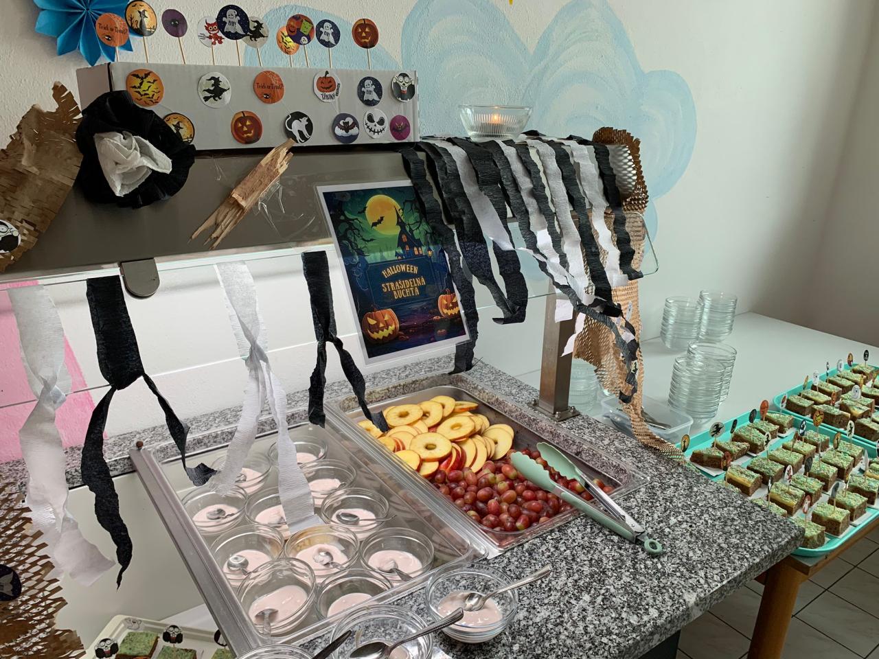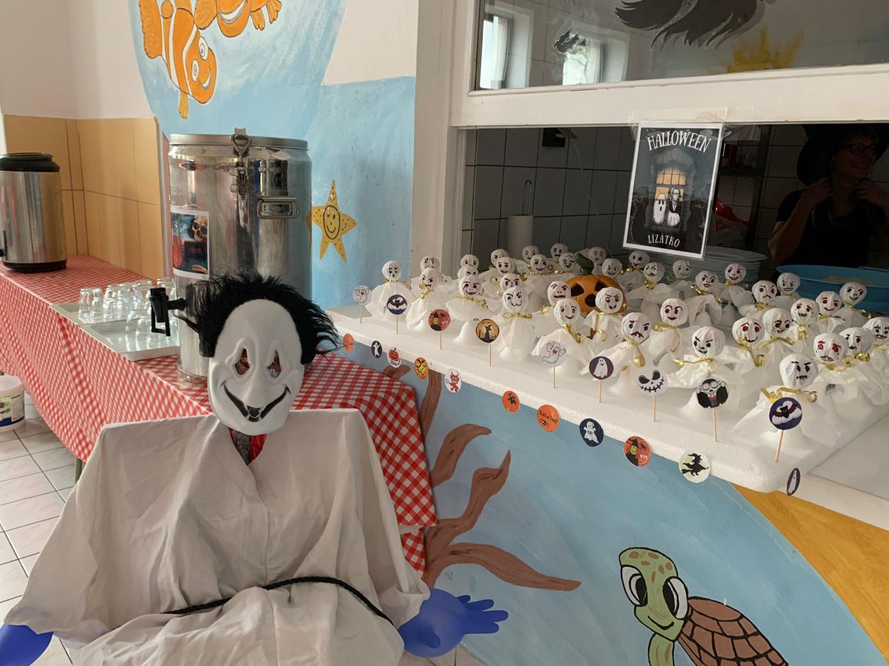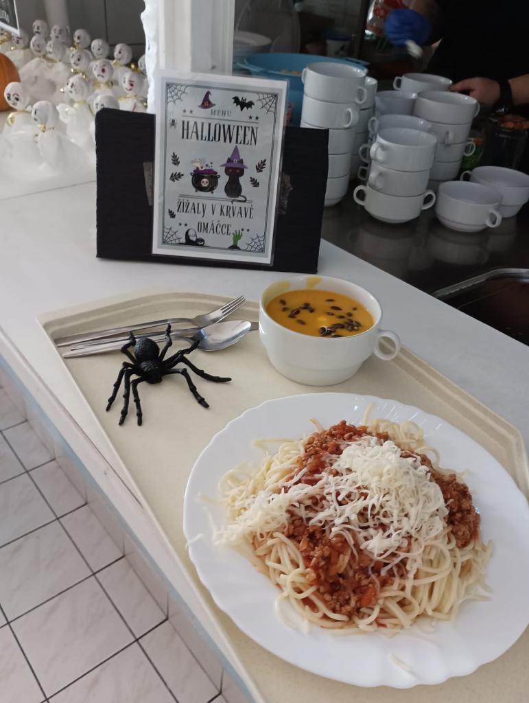 Naše paní kuchařky pro nás nachystaly pravé halloweenské menu a krásně nám vyzdobily školní jídelnu. Mohli jsme tak ochutnat žížaly v krvavé omáčce, dýňovou polévku, strašidelnou buchtu, upíři pití a halloweenské lízátko. Děkujeme!