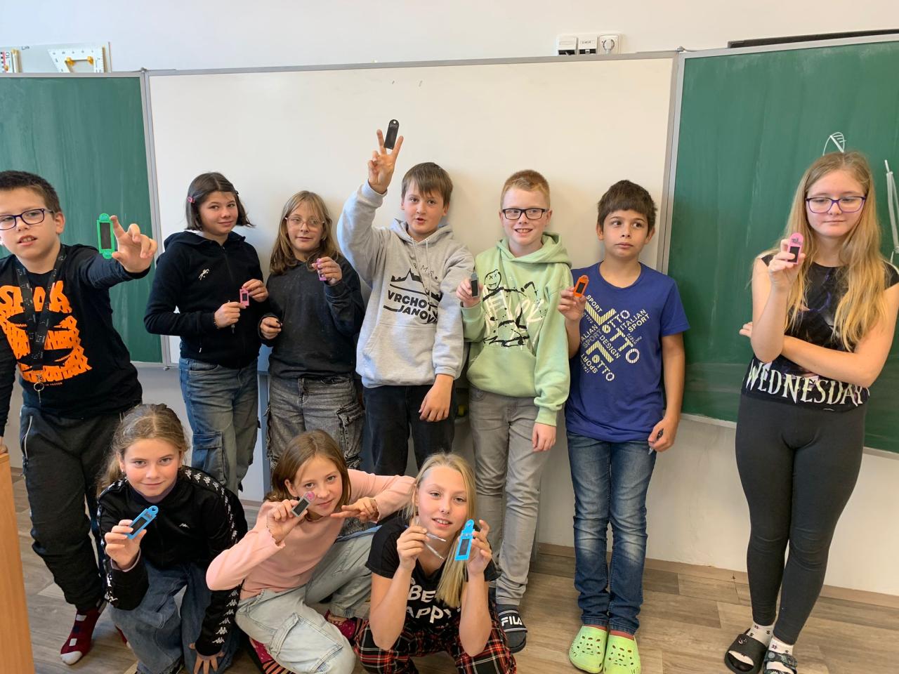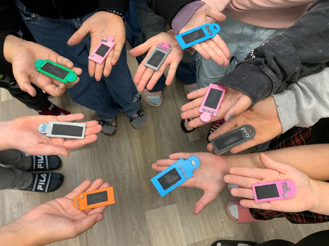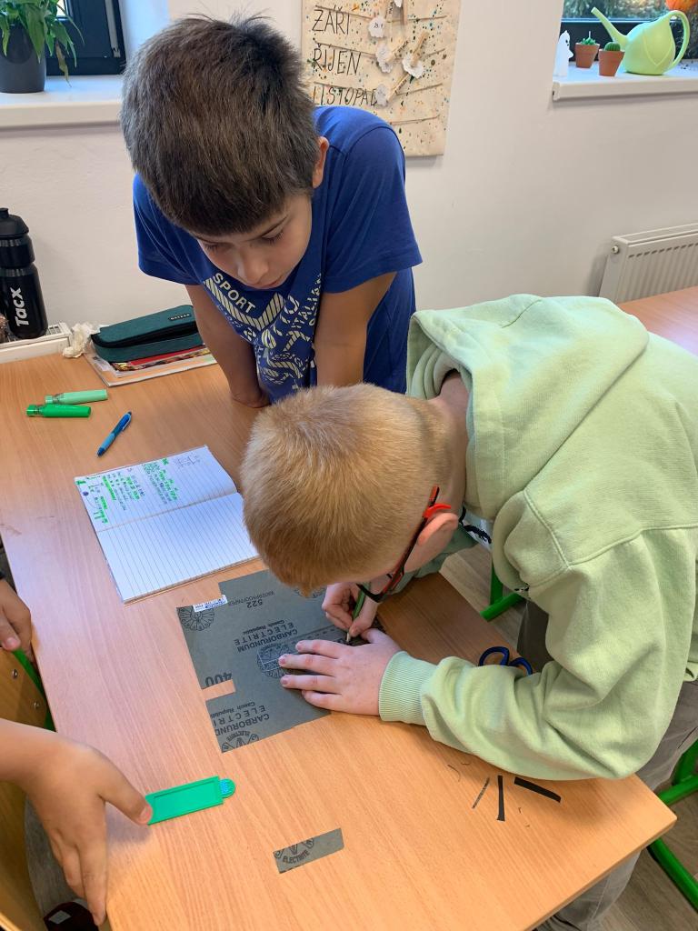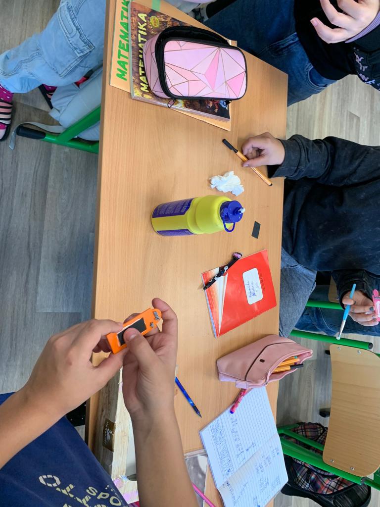 Žáci si v modelovacím programu Tinkercad vytvořili návrh pro 3D tisk. Po vytisknutí si na destičku nalepili brusný papír. Destičku budou využívat k zabrušování tuhy kružítka.